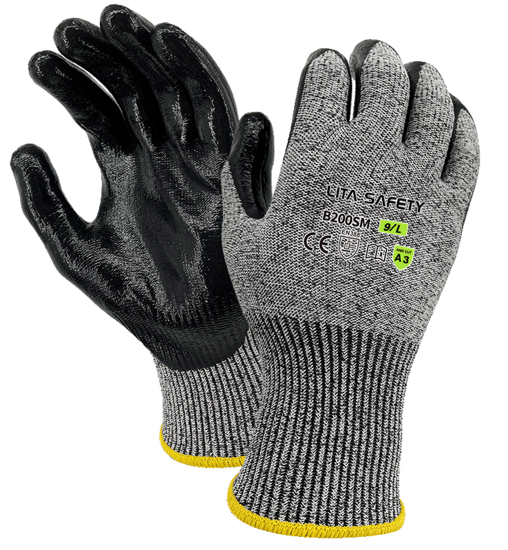 Los guantes resistentes recubiertos con nitrilo B200SM están diseñados para ofrecer una protección, agarre y durabilidad de corte excepcional para una amplia gama de aplicaciones industriales. Construido con un revestimiento de fibra gris y fibra gris de calibre 13 y terminado con un recubrimiento negro de palma de nitrilo liso, estos guantes proporcionan una excelente resistencia contra los cortes mientras mantienen flexibilidad y comodidad. Con clasificaciones EN388 de 4x43c (ANSI A3) o 4x43D (ANSI A4), ofrecen un rendimiento de seguridad confiable para entornos de riesgo medio a alto.