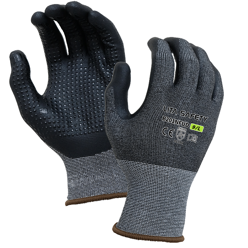 Los guantes con espuma de nitrilo B201NFUD están diseñados para un agarre y protección superiores en ambientes secos y ligeramente aceitosos. El revestimiento de poliéster/spandex de calibre 15 proporciona flexibilidad y transpirabilidad, mientras que la palma de nitrilo de micro espuma negra con patrón punteado asegura una mayor resistencia a la retención y a la abrasión. Estos guantes son ideales para el manejo de precisión, el ensamblaje y las aplicaciones industriales ligeras.