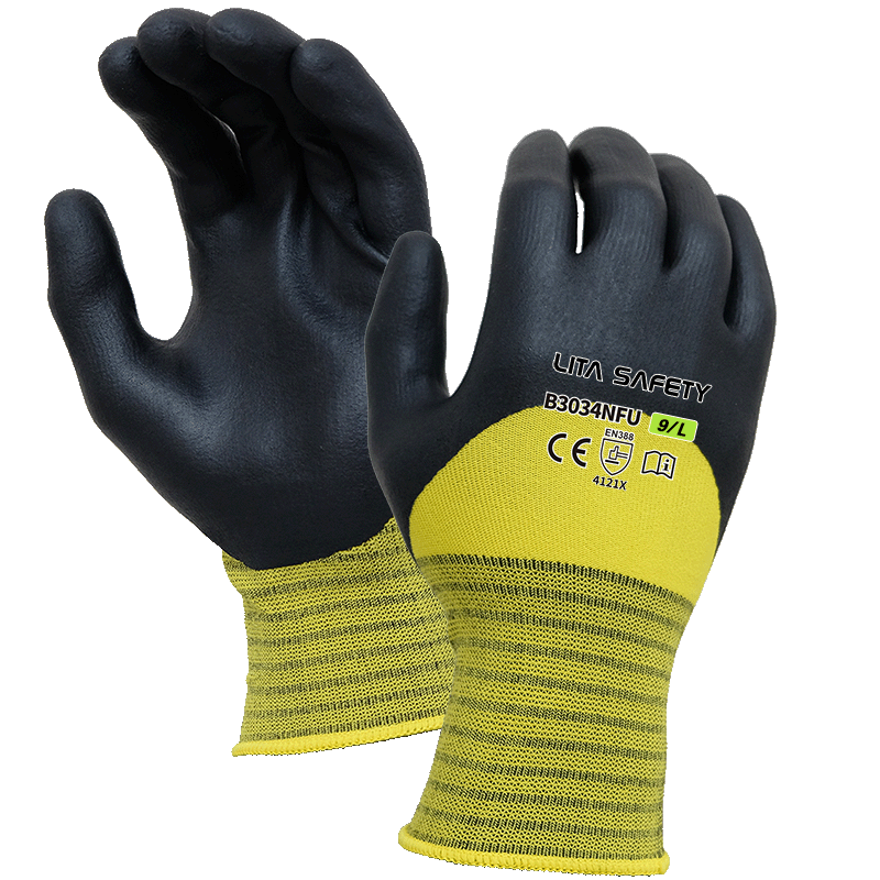 Los guantes de recubrimiento de nitrilo de micro espuma negro B3034NFU están diseñados para trabajadores que requieren un agarre excepcional, durabilidad y comodidad. Con un forro de poliéster/spandex amarillo de 15 calibre, estos guantes combinan flexibilidad y transpirabilidad con un diseño de alta visibilidad. La cobertura 3/4 de recubrimiento de nitrilo de micro espuma negra ofrece una protección mejorada y un manejo seguro en condiciones secas.