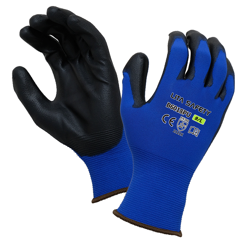 Los guantes de trabajo recubiertos de B6018PU PU combinan la comodidad, la funcionalidad y la durabilidad para los entornos de trabajo de precisión. Con un forro de nylon azul de calibre 18, estos guantes ofrecen un ajuste ultra ligero y transpirable que maximiza la destreza para tareas delicadas. El recubrimiento de palma de poliuretano (PU) súper suave negro proporciona un agarre excepcional en condiciones secas mientras mantiene flexibilidad para un desgaste extendido.