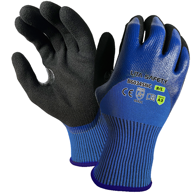 El aceite B6034SNC y los guantes resistentes a los cortes ofrecen una protección excepcional para los trabajadores que manejan materiales aceitosos, afilados y abrasivos. Hecho a mano con un HPPE azul de calibre 15, fibra de vidrio y un revestimiento de punto de poliéster, estos guantes combinan una alta resistencia de corte con una mayor resistencia al agarre y al aceite. Con un revestimiento azul de nitrilo liso 3/4 complementado por un revestimiento de palma de nitrilo arenoso negro, ofrecen un excelente manejo y durabilidad. La entrega de pulgar reforzada agrega longevidad en áreas de desgaste crítico. Certificado a EN388: 4x42c y ANSI A3, estos guantes proporcionan seguridad y comodidad confiables en aplicaciones industriales exigentes.