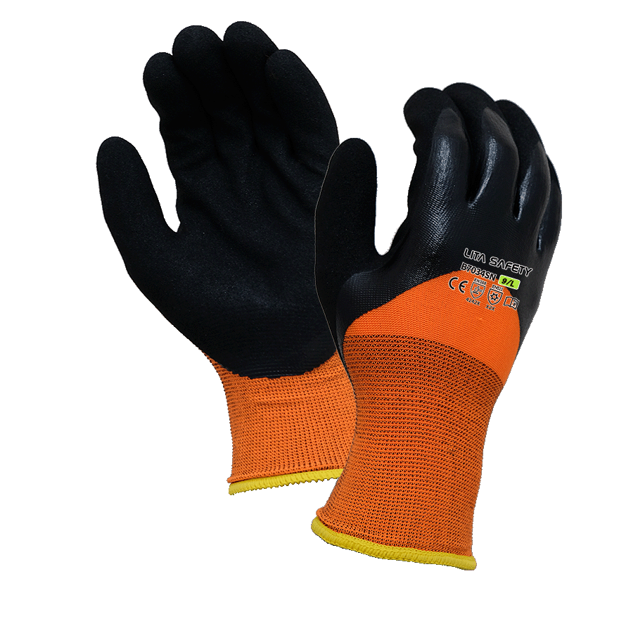 Los guantes de trabajo cálidos B7034SN para el invierno están diseñados para ofrecer una calidez, comodidad y protección confiables para los profesionales que operan en entornos fríos, húmedos y abrasivos. Construido con un revestimiento de doble capa para un excelente aislamiento térmico, estos guantes también cuentan con recubrimientos de nitrilo dobles que proporcionan una mayor agarre y resistencia superior al aceite. El acabado externo de nitrilo arenoso asegura una fuerte tracción en las superficies grasas o resbaladizas, mientras que la capa interna de nitrilo liso forma una barrera confiable contra la penetración líquida. Esta estructura de doble recubrimiento no solo maximiza la durabilidad y el agarre, sino que también mantiene las manos secas y protegidas, lo que hace B7034sn el guante ideal para las duras tareas industriales invernales.