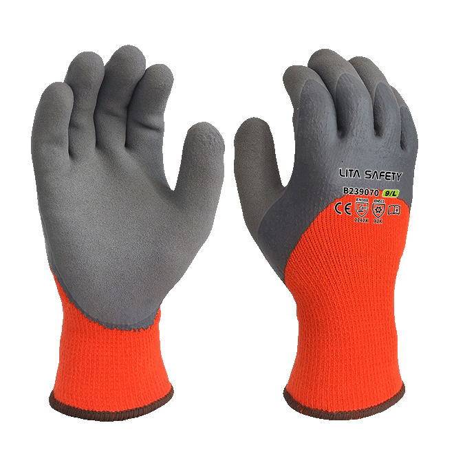 El guante de invierno impermeable está diseñado para proporcionar una calidez, comodidad y protección excepcionales en entornos de trabajo fríos y húmedos. Construido con un revestimiento de terry acrílico de alta visibilidad de 10 calibres en naranja, este guante ofrece un excelente aislamiento y visibilidad para condiciones de poca luz. Su recubrimiento de látex de doble capa, que tiene un recubrimiento de látex negro y látex negro y un acabado de palma de látex arenoso, genera impermeabilización superior, agarre mejorada y resistencia a la abrasión. Un pulgar totalmente sumergido ofrece protección adicional en áreas de alto contacto.